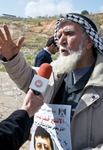 Administrative detention as an Israeli policy is the target of Adnan’s hunger strike. Young people (see picture at top) gather in Ramallah to protest Adnan’s detention. Musa Adnan, Khader’s father, had joined his son in the hunger strike. Musa Adnan is pictured at right, talking with a reporter.