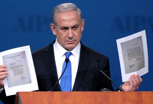 The picture at top is of Prime Minister Netanyahu holding letters exchanged between the World Jewish Congress and the US War Department in 1944. The picture is by Cliff Owen, of the Associated Press.