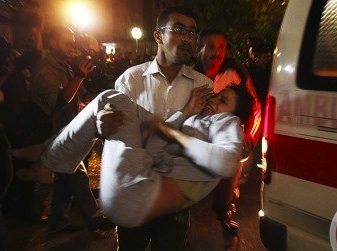 In the picture at the top, a Palestinian ambulance worker carries a wounded man after an Israeli air raid. The photo is from Ma’an. It is one of a series of pictures by Reuters photographers Ahmed Zakot, Ibraheem Abu Mustafa, Mohammed Salem and Ali Hassan.