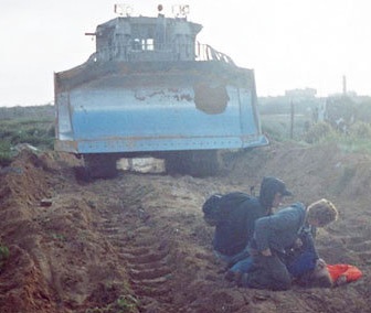 In the picture at right above, shocked friends from the International Solidarity Movement try to revive a dying colleague. The blue bull dozer continues on its mission to destroy a Palestinian family home.