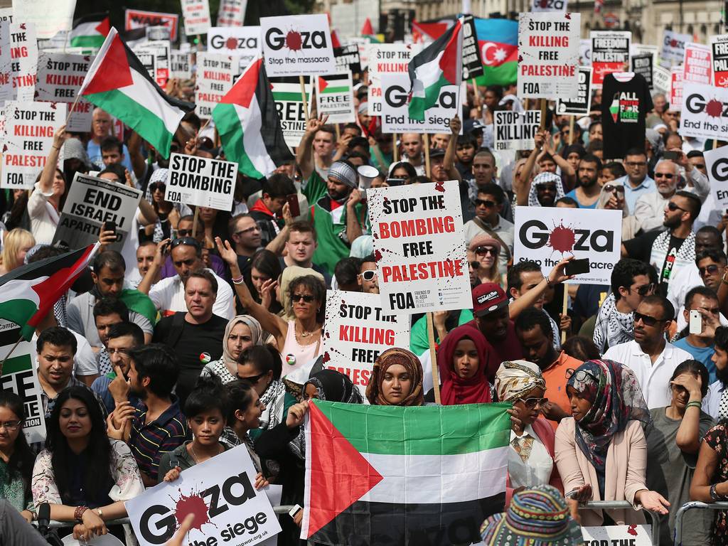 The picture of London supporters of the Palestinians is a Getty photo which ran in the Independent.