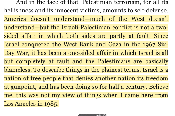 One key paragraph in his memoir outlines his understanding of the distorted reality Israel and Israelis have created to live as occupiers. Below is a screen shot of that paragraph: