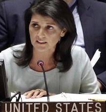 Prior to the vote which rejected the U.S. President’s “gift” of Jerusalem to Israel, the U.S. Representative to the UN, Nikki Haley (below), warned nations that votes against the U.S. would be remembered. She added, “We will take names,” sounding more like a Mafia Don than a diplomat..